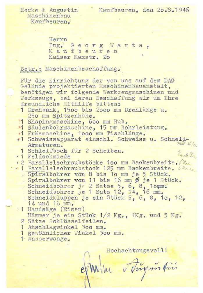 Franz Hecke und Max Augustin die sich aus dem 2. Weltkrieg kannten, gründen zusammen auf dem damaligen DAG Gelände - dem heutigen Neugablonz - in einem alten Bunker die "Maschinenbauanstalt" Hecke & Augustin.